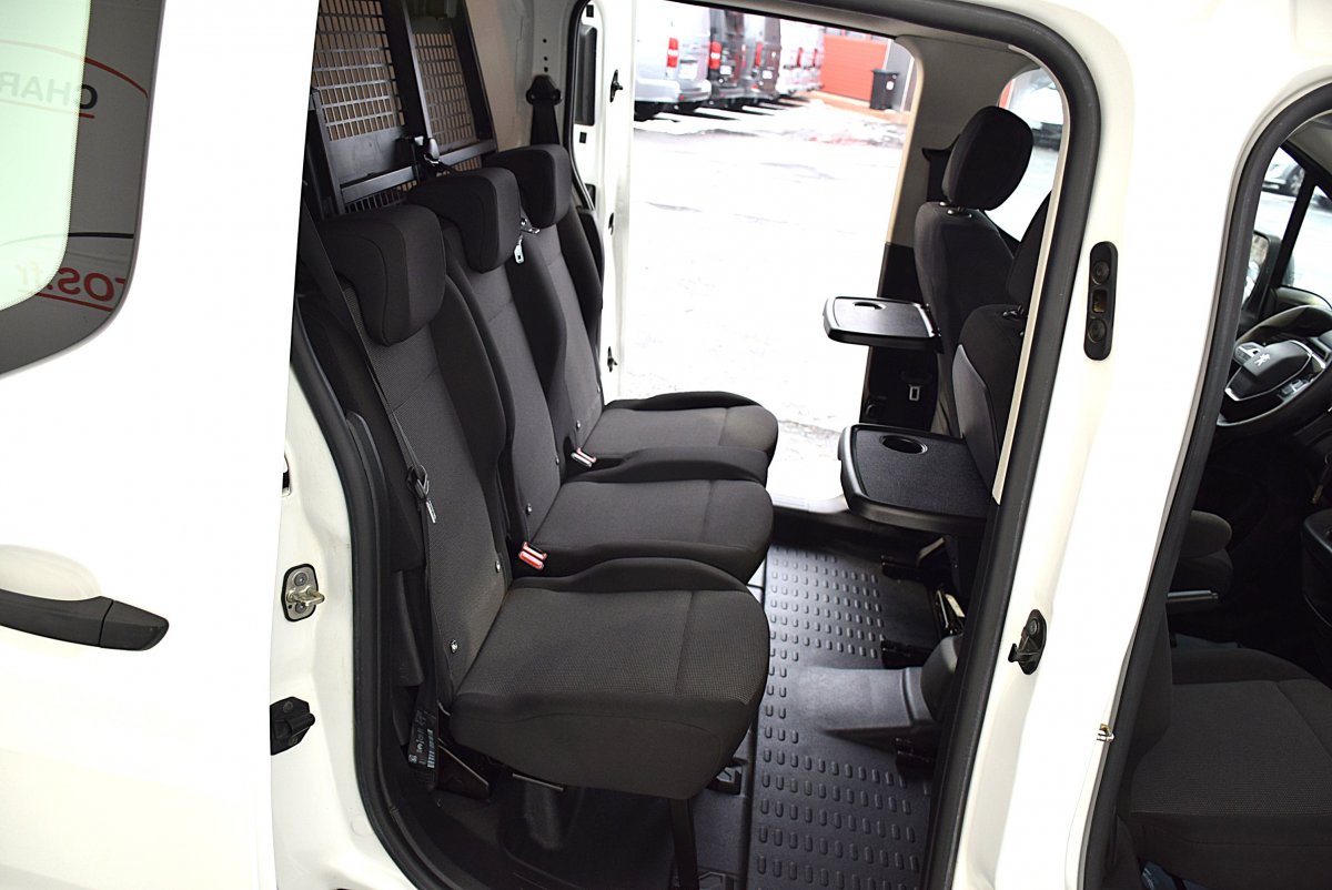 clim automatique bi-zone, ordinateur de bord, phares auto, capteur de pluie, antibrouillards av, rétros rabattables, régulateur de vitesse, radar de recul av & ar, alerte de sortie de voie, active safety-brake, lecture des panneaux de signalisations, volant multifonctions réglable, pack rangement, accoudoir av, capucine de toit, radio média tactile, interface usb-bluetooth, gps europe, commande vocale, duplication smartphone, convertisseur 220volt, sellerie tissu bi-ton, sièges réglables en hauteur, sièges av chauffants, tablettes aviation, isofix, banquette ar 2/3 1/3 rabattle à plat, cloison de séparation coulissante sur rail, double cabine repliable avec arret de charge coulissant, protection pvc dans là zone de chargement, deux portes ar 180° vitrée avec essuie glace, 2 portes latérales coulissantes, abs-esp, stop&start, tpms, roue de secours, attelage mixte...